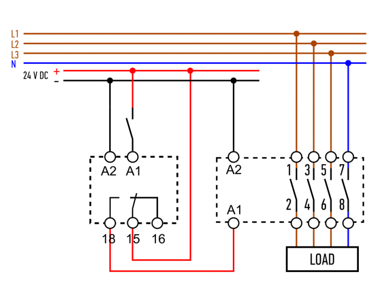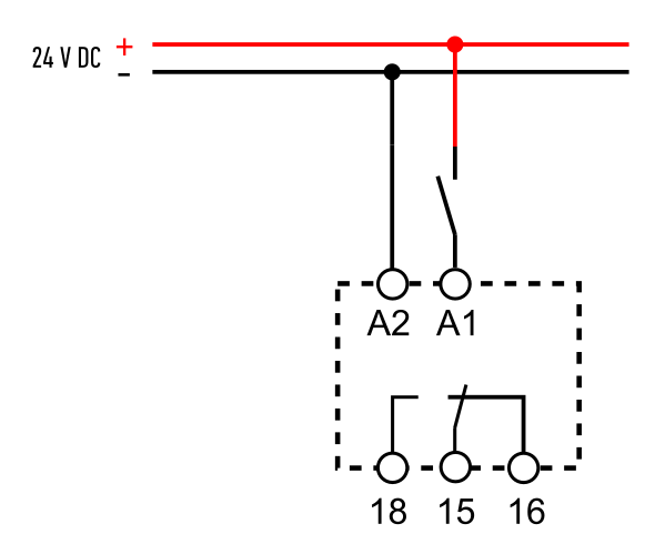 Para no complicarnos demasiado, consideraremos que la bobina del contactor también se alimenta con 24 V DC, aunque recuerda que gracias al contacto seco del temporizador 80.01 podemos usar cualquier otra tensión que el proyecto requiera.