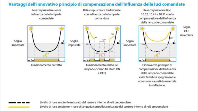 Infine, un altro motivo per cui la scelta è ricaduta sul crepuscolare Finder, è la funzione chiamata “compensazione dell’influenza della luce comandata” (brevetto Finder) che attraverso un calcolo matematico, evita fastidiosi accensioni e spegnimenti continui dell’illuminazione purché la somma fra luce dell’ambiente e luce artificiale non superi i 120 lux.