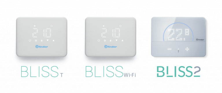 Finder Bliss è il nome che racchiude i dispositivi per la termoregolazione studiati da Finder per chi desidera una gestione intelligente ed evoluta dell’impianto, controllabili manualmente, tramite smartphone o con la voce.