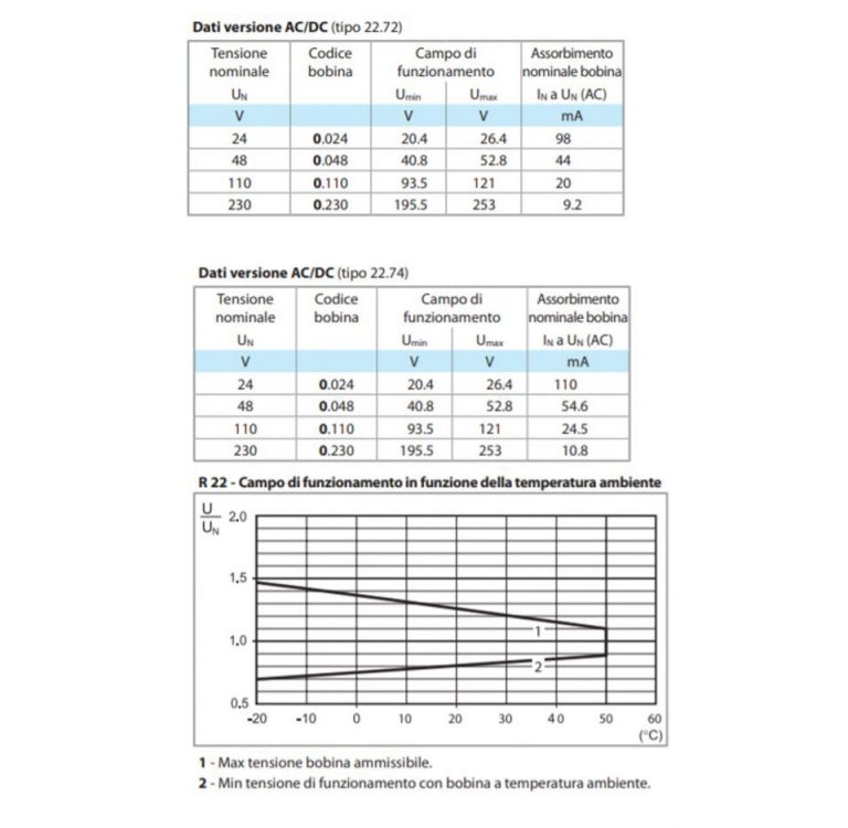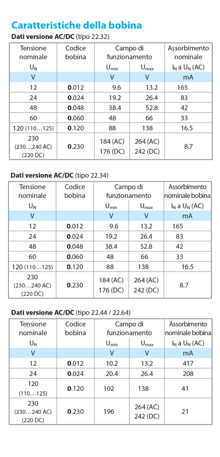 E’ possibile scegliere il tipo di bobina con la tensione di alimentazione nominale necessaria all’applicazione, utilizzando la seguente tabella: