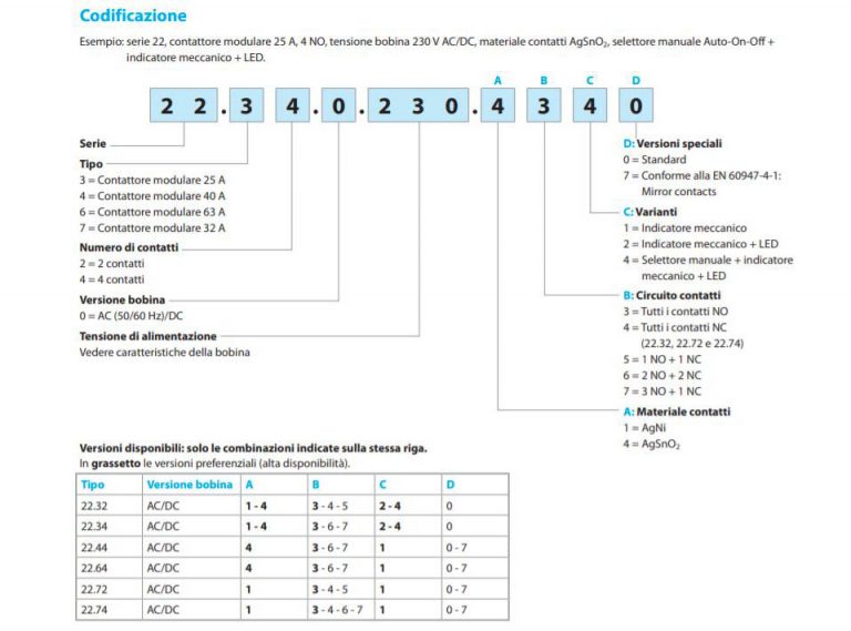 Fra i contattori modulari Finder è possibile scegliere fra entrambi i materiali, identificati nella quart’ultima cifra del codice prodotto dal valore 1 per AgNi e 4 per AgSnO2 .