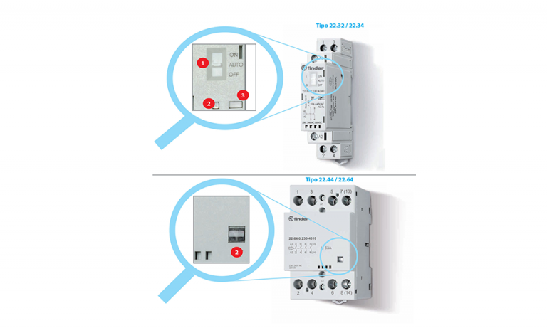 I contattori modulari Finder tipo 22.32 e 22.34 da 25 A, a 2 o 4 contatti presentano tutte e 3 le funzioni.