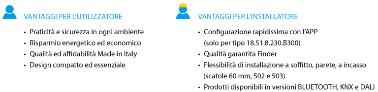 Installando i dispositivi della Serie 18 Finder si garantisce una maggiore sicurezza degli ambienti e l’ottimizzazione dei consumi. Le logiche di funzionamento dei rilevatori Finder dipendono dalla presenza/dal movimento nell’area di rilevamento, limitando così l’attivazione delle luci solo quando l’ambiente risulta “abitato o frequentato”.