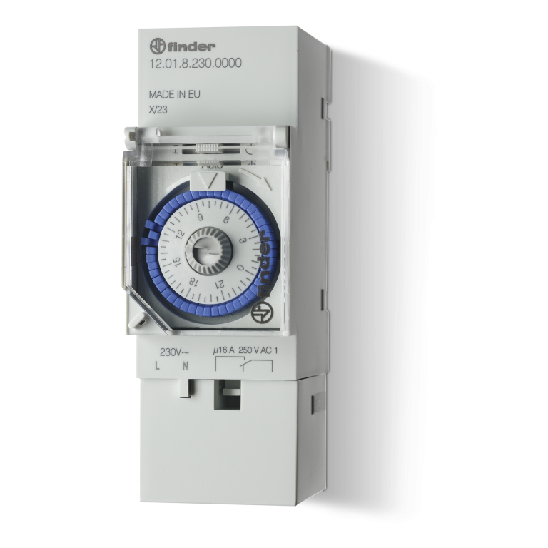A digital time switch is programmable and can be either daily, weekly or even yearly programmed by a specific time and date. They offer more options than the mechanical time switches and can handle lots of different situations. Finder’s 12 Series electronic time switches provide pin-lock protection, minimising the opportunity of tampering with the configured settings.