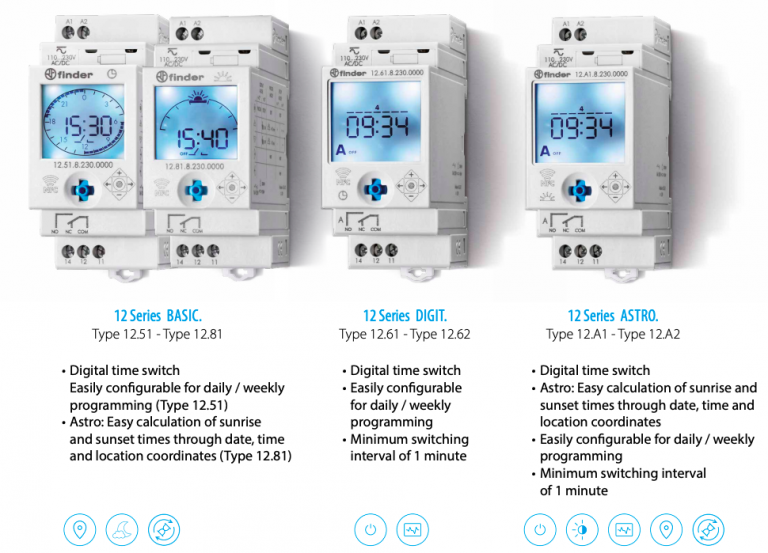 Finder’s 12 Series time switches are ideal for programming lighting systems in both public and private areas. From the configuration of garden lights to the integration of street light systems, Finder 12 Series time switches are the perfect tools to create light when you need it!