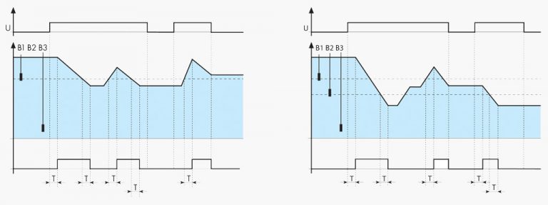 Both the 72 Series level control relays have ‘Positive Safety Logic’ meaning that the ‘make’ contact is closed when the monitored level is within the target range. The ‘make’ contact opens if the level is not within the range after the set time delay. This set delay offered with the 72 Series would turn the motor on or off within 0.5 s or 1 s. If there are ripples or foam on the surface this could lead to increased motor cycling or ‘hunting’. This can be alleviated with the 7 s run-on time delay offered with the 72.01 where the liquid would run past the electrode level.