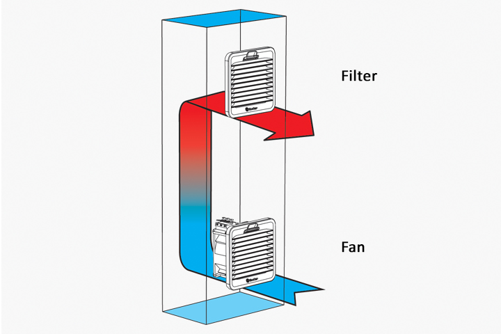 A common approach is to have the Filter Fan placement towards the bottom of the enclosure drawing in cooler air, and the Filter Guard at the top where the heat collects. This setup would require a 7F.20 Series ‘draw-in’ Filter Fan and a 7F.02 Series Filter Guard shown in the example to the left.