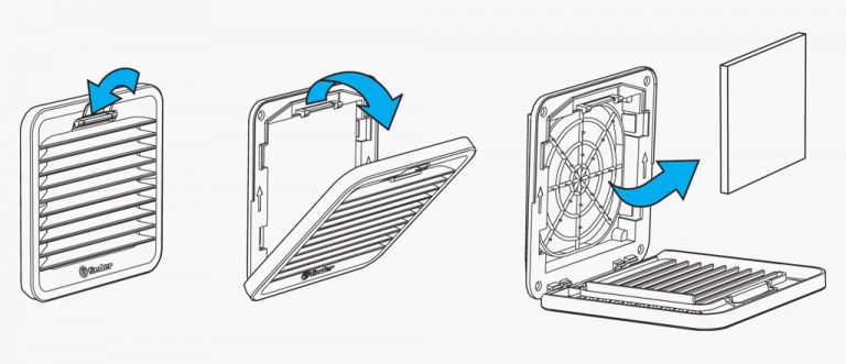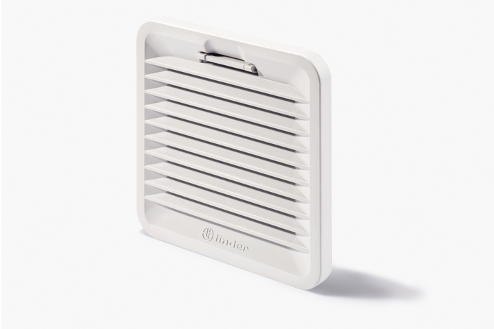 Another consideration for airflow is maintenance. In each Filter Fan and Filter Guard there is a filter media or ‘mat’ to filter out the dust and particles prior to them getting into the enclosure. This media does require periodic maintenance to insure proper airflow. Cleaning or replacement of the media is easy with the construction of Finder’s 7F Filter Fans. The 7F design includes a hinged cover for quick and easy inspection or replacement of the filter media. Depressing the tab at the top allows the cover to swing downwards exposing the media. After maintenance or replacement simply move the grill closed until the tab snaps back in latching the cover in place.