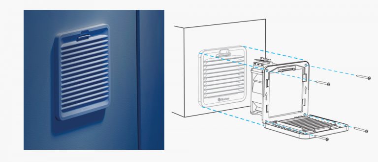 Ease and flexibility of mounting is important. Unlike axial or ‘muffin’ fans with a separate metal or plastic guard, the Filter Fan is an all in one component. With each fan Finder ships a template for cut out information and 4 screws. For most panels (sidewalls 1.2 – 2.4 mm in thickness) simply mount the fan into the cutout until the built-in installation clips snap in place.