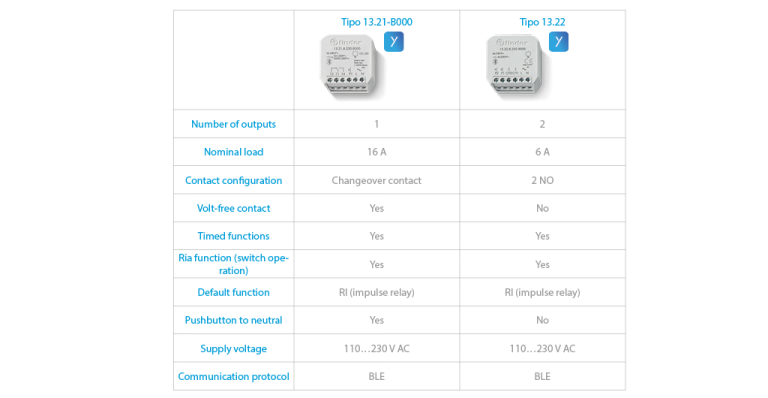 The 13.21.8.230.B000 YESLY multifunction relay is characterized by a single 16A changeover output contact, 12 selectable functions – including “RIa – Pulse relay (switch control)” and various timed functions (see table 1). Besides its maximum 16A switchable load current, it is also notable for having an input for wired pushbuttons and for the possibility of managing up to 8 YESLY scenarios.