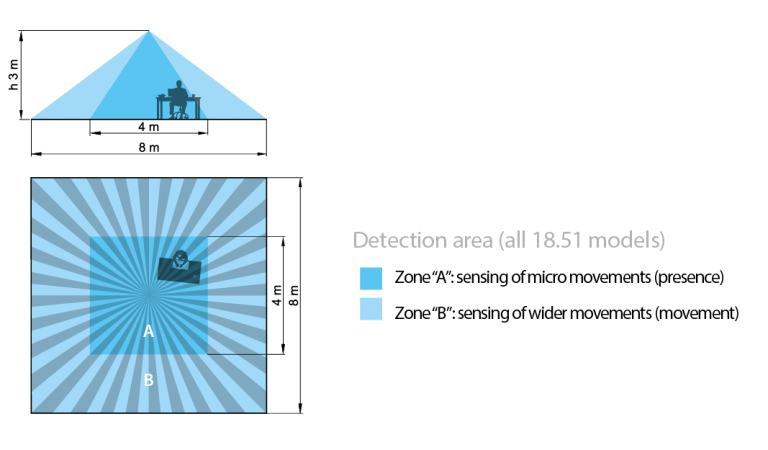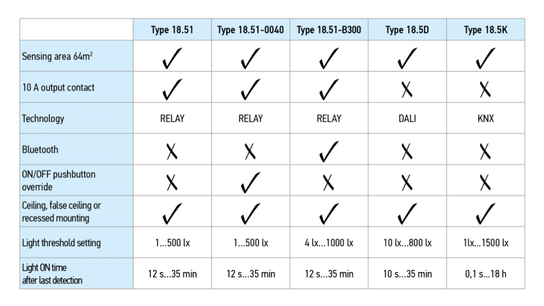 All the Type 18.5x devices are suitable for detecting micro movements and are ideal for application in offices, meeting rooms or classrooms. They sub-divide into the following versions: