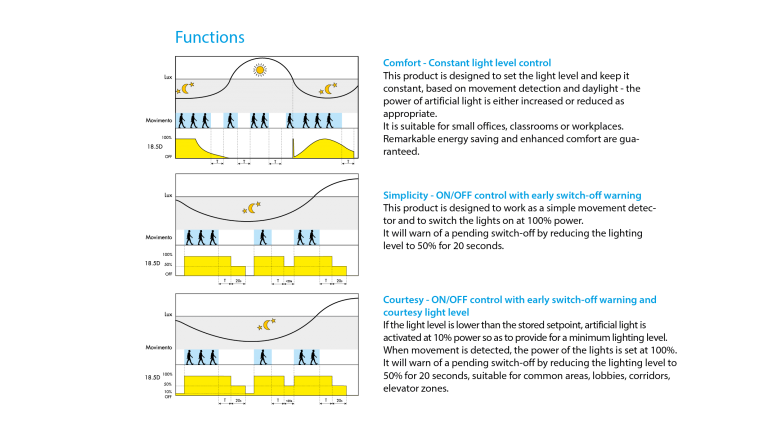 In turn divided into the EASY version (Type 18.51-300), with operation in automatic mode, and the ON/OFF version (Type 18.51-0040) to accept an external pushbutton to force the output contact, and with dynamic brightness compensation functionality.
