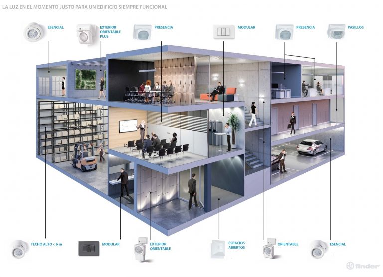 Los detectores de movimiento y presencia de Finder son dispositivos adecuados para numerosas aplicaciones, que se pueden instalar en áreas de tránsito, como pasillos y escaleras; en baños y garajes, o cerca de casas y edificios.
