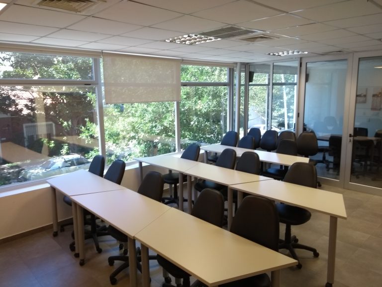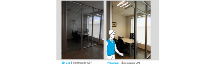 En este caso, el sensor de presencia está embutido en el techo, y es ideal para esta oficinas que cuenta con paredes de vidrio, ya que no se utiliza llave de luz.