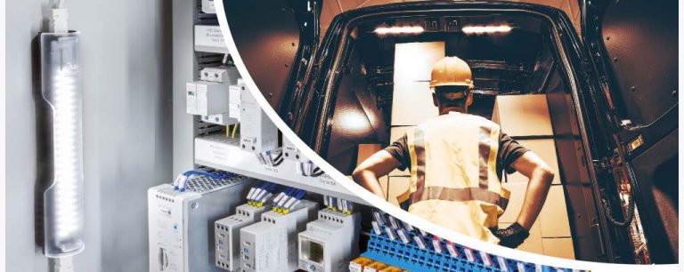 Las lámparas LED de la Serie 7L de Finder también se utilizan en lugares como furgonetas o talleres móviles, y pueden alimentarse desde un vehículo a través de una toma de 12 V.
