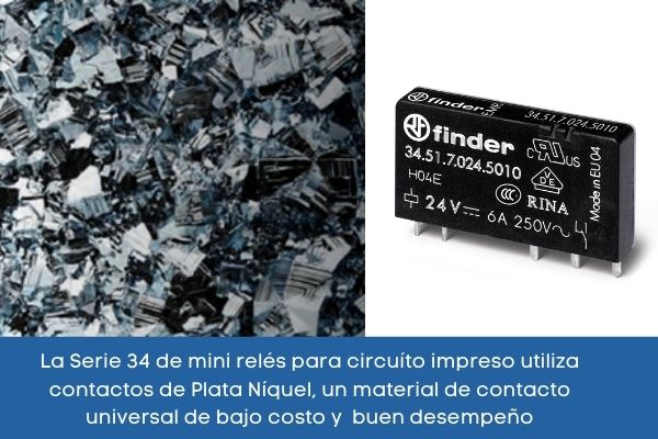 La Serie 34 de mini relés para circuito impreso utiliza contactos de Plata Níquel, un material de contacto universal de bajo costo y buen desempeño.