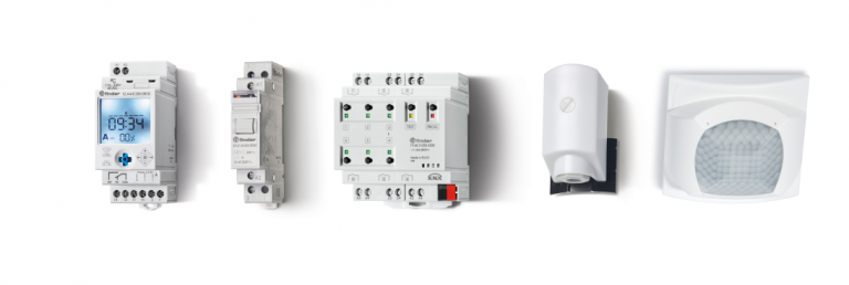 Toda la gama de soluciones para el control de iluminación de Finder lleva este material por defecto. Desde los telerruptores, pasando por los detectores de movimiento, hasta el actuador de 6 salidas del sistema KNX.