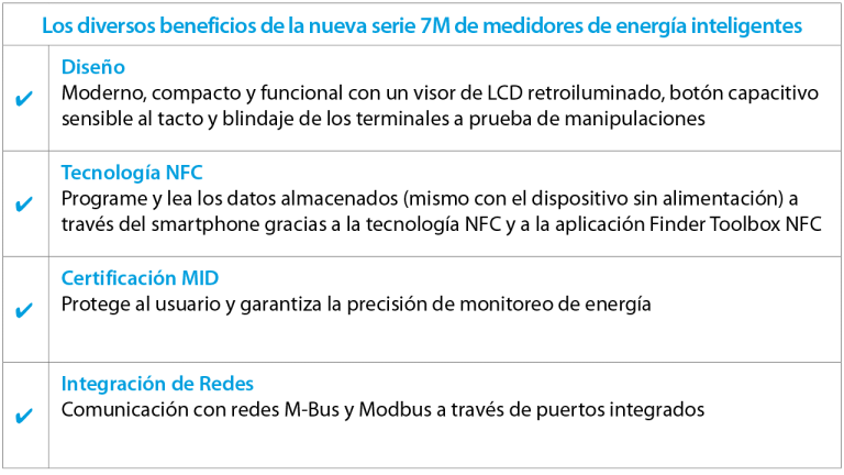 Finder presenta su nueva Serie 7M de medidores de energía. Dispositivos caracterizados por un diseño innovador, botón capacitivo sensible al tacto y pantalla LCD retroiluminada, además de ser programable vía NFC gracias a la aplicación Finder Toolbox NFC.