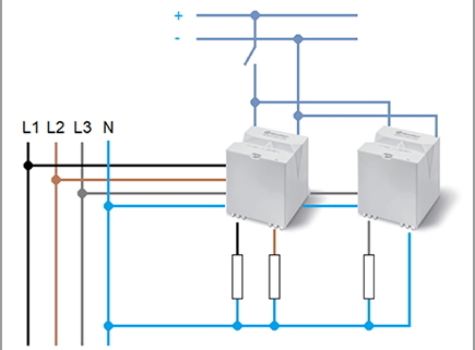 Grâce à cette configuration, il est possible de commuter une charge triphasée + neutre (jusqu’à 100 A) avec seulement deux relais montés en tandem. Ce relais est parfaitement adapté aux bornes de recharge jusqu’à 55 kW.