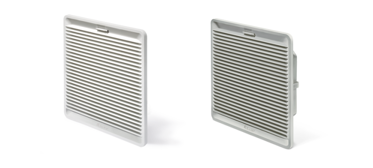 Pour compléter la circulation d’air, Finder propose des grilles de sortie permettant l’évacuation passive de la chaleur. Les modèles 7F.02 (usage intérieur) et 7F.03 (usage extérieur) sont conçus pour s’associer aux ventilateurs à filtre et existent en cinq tailles correspondantes. Ces grilles nécessitent une profondeur minimale à l’intérieur du coffret, se montent rapidement et leur filtre se remplace aisément. Les filtres utilisent une fibre synthétique auto‑extinguible, résistent à des températures jusqu’à +100 °C et disposent d’un degré de filtration G3 (80–90 %). Pour l’extérieur, la version 7F.03 associe une couleur plus sombre et une protection NEMA 3R en plus de l’IP54, afin de résister aux intempéries.