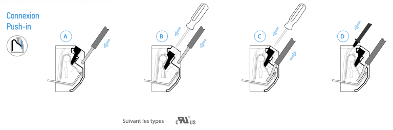 Les bornes Push-in permettent une connexion rapide, simple et sûre avec un câble rigide ou un câble souple avec embout. Par ailleurs, chaque borne Push-in est équipée d’un orifice permettant le passage d’une sonde de testeur afin de réaliser des mesures en toute sécurité.