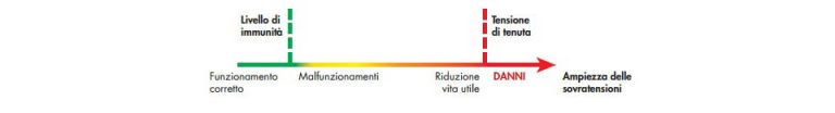 Come mostra la Figura 1, finché la sovratensione rimane al di sotto del livello di immunità, il funzionamento dell’apparecchio non viene compromesso. Il problema si presenta nel momento in cui la sovratensione supera questo livello: se di poco, possono verificarsi solo malfunzionamenti dell’apparecchiatura, se lo supera per valori superiori o ripetitivi, l’apparecchiatura potrebbe subire una riduzione della sua vita utile, mentre il superamento eccessivo del livello può causare un guasto permanente.