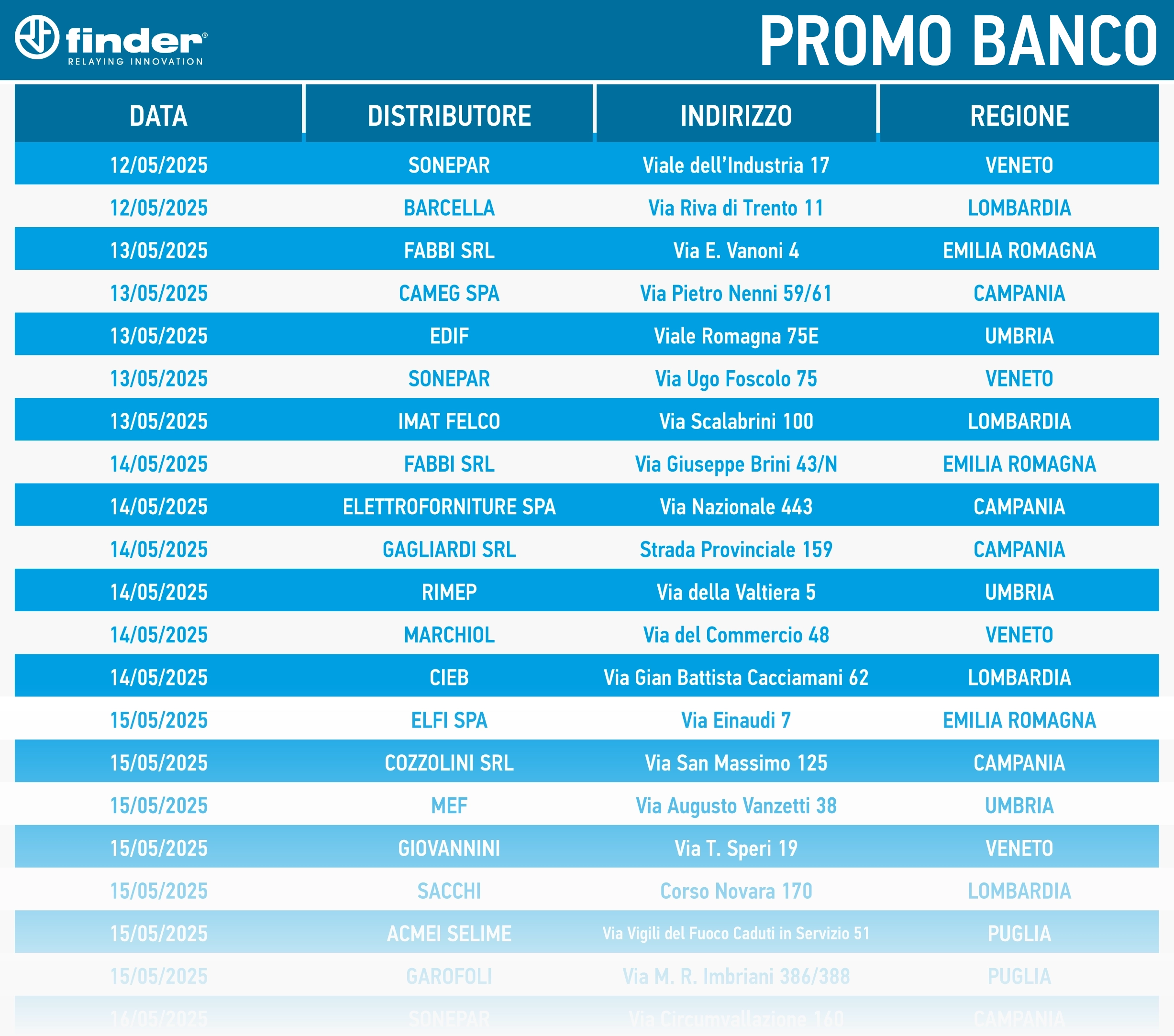 L’iniziativa, dedicata ai professionisti dell’installazione e manutenzione degli impianti elettrici, offre l’opportunità di conoscere le ultime novità a catalogo, ricevere consulenza tecnica e approfittare di sconti speciali su una selezione di prodotti a marchio Finder e 4box.
