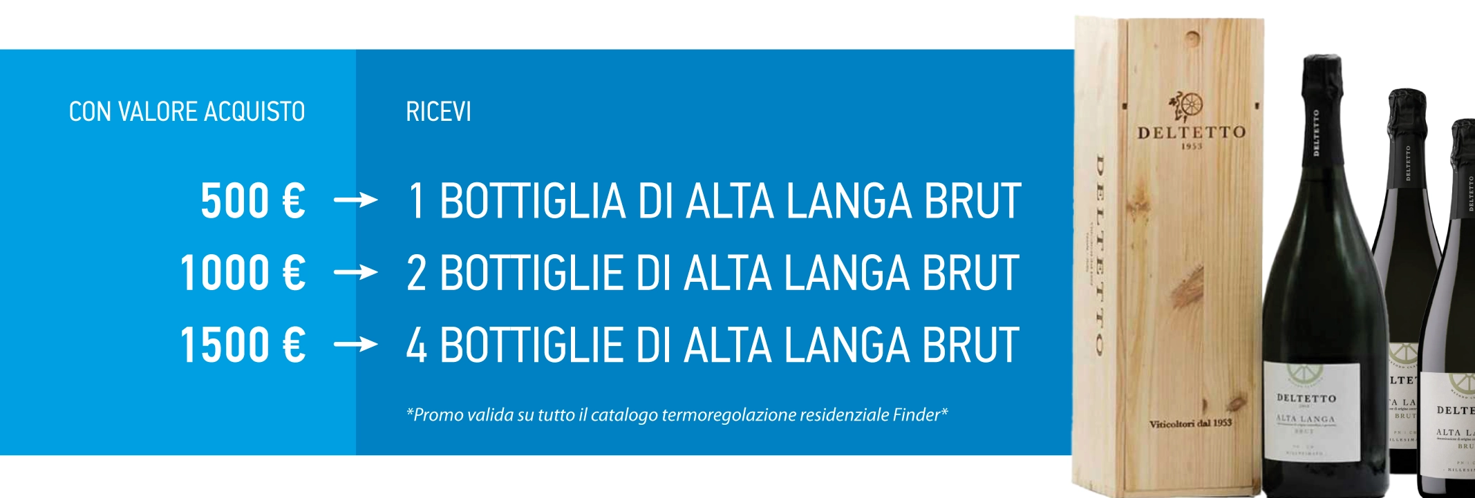 Con l’acquisto di almeno 500 euro di termostati e cronotermostati Finder, gli installatori elettricisti riceveranno una o più bottiglie di ALTA LANGA Brut della Cantina DELTETTO (Canale d’Alba).