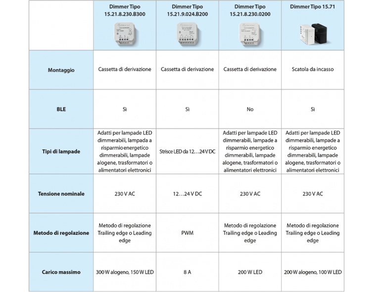 Tra i dimmer più recenti prodotti da Finder troviamo quattro dispositivi, ognuno dei quali presenta particolarità distinte, raccolte nella seguente tabella comparativa: