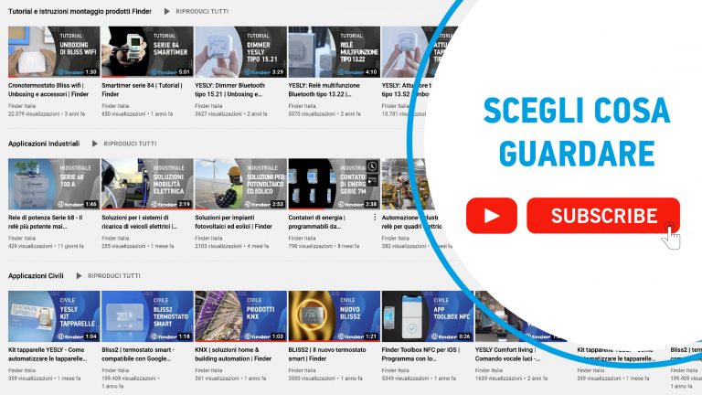 All’interno del canale sono inoltre presenti diversi video e playlist che raccolgono i tutorial e le istruzioni di molti prodotti Finder come: orologi (interruttori orari) della Serie 12, i prodotti per smart home della gamma YESLY o i termostati smart BLISS.