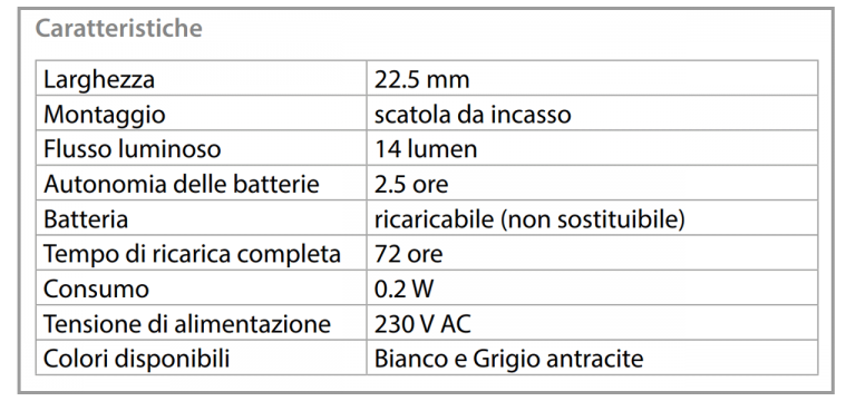 Per ottenere una maggiore sicurezza, LUMOS, vanta un’autonomia prolungata della batterie ricaricabili, pari a 2,5 ore. Questo arco di tempo permette di eseguire le attività ordinarie in caso di interruzione della corrente, come l’evacuazione dell’immobile o il riarmo dell’impianto elettrico.