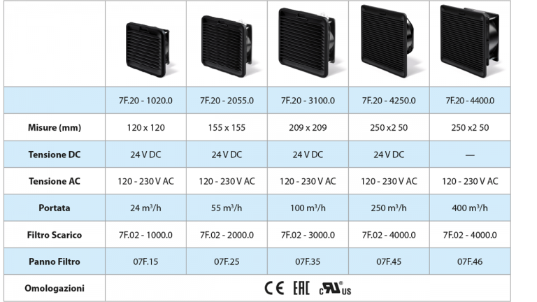 I nuovi ventilatori con filtro in colorazione nera RAL 9004, presentano le medesime caratteristiche tecniche delle attuali versioni sia a 120 V o 230 V AC, che a 24 V DC vantando un alto livello di silenziosità, un minimo ingombro, portata d’aria da 24 fino a 400 m3/h con flusso libero o da 14 a 270 m3/h con filtro di scarico installato.