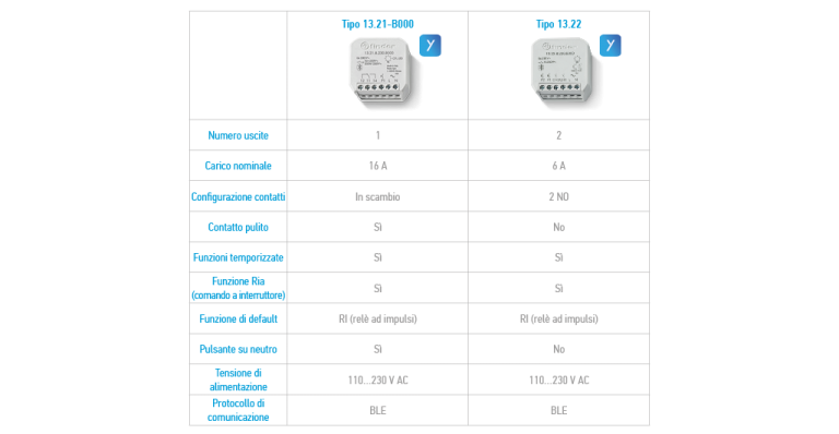 Il relè multifunzione Bluetooth Tipo 13.21.8.230.B000 è caratterizzato da 1 uscita da 16 A in scambio, 12 funzioni selezionabili – tra cui ”RIa – Relè ad impulsi (comando a pulsante)” e diverse funzioni temporizzate (vedi tabella 1). Si distingue inoltre per 16 A di carico massimo commutabile, 1 ingresso per pulsanti cablati e per la possibilità di gestione fino ad 8 scenari YESLY.