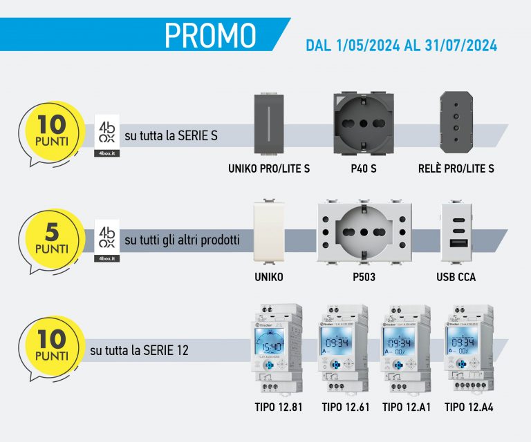 Oltre a tutti i prodotti già aderenti, entrano nel programma fedeltà anche gli interruttori orari ed astronomici della Serie 12 e tutta la gamma 4box, brand oggi parte del gruppo Finder che propone un’offerta innovativa per gli impianti elettrici civili.