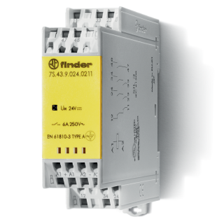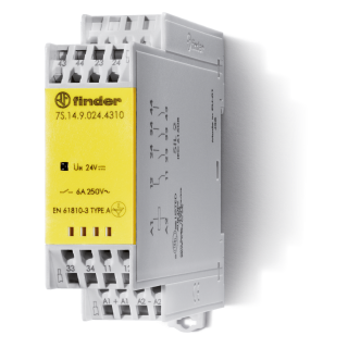 Tipo 7S.43 – Relè modulare con contatti guidati per applicazioni di sicurezza SIL3Relè con contatti guidati “Tipo A” secondo EN 61810-3 (ex EN 50205) per applicazioni di sicurezza fino a SIL3Sistema con architettura a canale doppio (1oo2) con due contatti NO, 1 contatto di retroazione e 1 contatto ausiliario