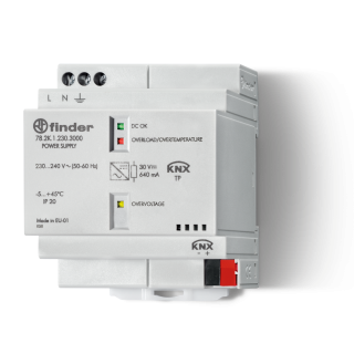 Tipo 78.2K - Alimentatore KNX 30V DC, 640 mAProtezione termica contro i sovraccarichi e protezione al cortocircuitoUscita a 30 V DC 640 mA, Bus KNX