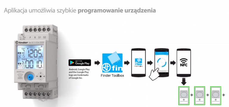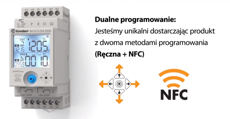 inder rozszerzył ofertę produktów programowalnych za pomocą smartfonu przy użyciu technologii NFC wraz z wprowadzeniem SMARTimera–nowego wielofunkcyjnego przekaźnika czasowego z dwoma wyjściami o obciążalności 16 A i całkowicie niezależnymi kanałami. SMARTimer posiada duży podświetlany wyświetlacz LCD dla łatwego wglądu w parametry użytkowe, takie jak: nastawiony czas, aktualny czas i odliczanie czasu; równocześnie wyświetlane są stany sygnału sterującego i wyjść przekaźnika. Programowanie jest elastyczne, pozwala stworzyć specyficzne kombinacje spośród 25 dostępnych funkcji dla każdego z kanałów. Wszystkie programy mogą być zabezpieczone kodem PIN. SMARTimer Findera, dzięki dużemu wyborowi funkcji, szerokiemu zakresowi nastaw czasowych i możliwości nastawienia czasu co 0.1 sekundy, sekundę, minutę i godzinę, zapewnia precyzję i umożliwia konfigurację w przedziale od 0.1 sekundy aż do 9999 godzin–(to ponad rok!)