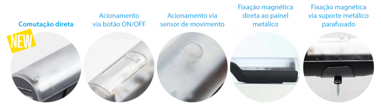 Esta importante característica permite a instalação permanente da lâmpada dentro do quadro elétrico com duas vantagens principais: pouquíssimas intervenções de manutenção e iluminação ideal em todos os pontos do quadro.