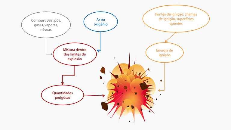 A mistura de substâncias inflamáveis na forma de gases, vapores, pós ou névoas, junto com condições críticas, como altas temperaturas, arcos elétricos ou na presença de faíscas, tem grande probabilidade de explodir.