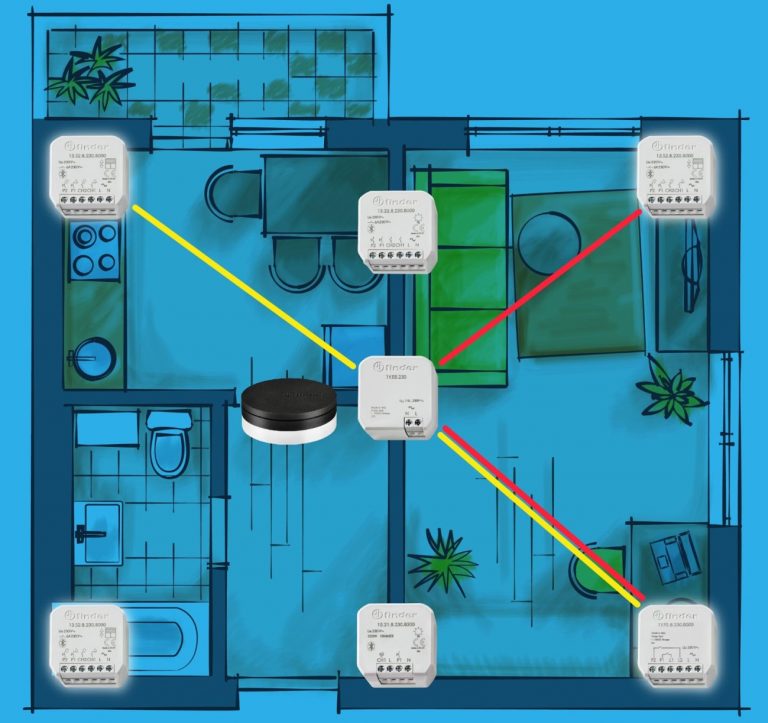O sistema para casas inteligentes da Finder gerencia a comunicação entre os vários dispositivos através da tecnologia Bluetooth Low Energy; para encontrar a cobertura ideal, é aconselhável instalar o gateway em uma posição central em relação a todos os outros dispositivos instalados .