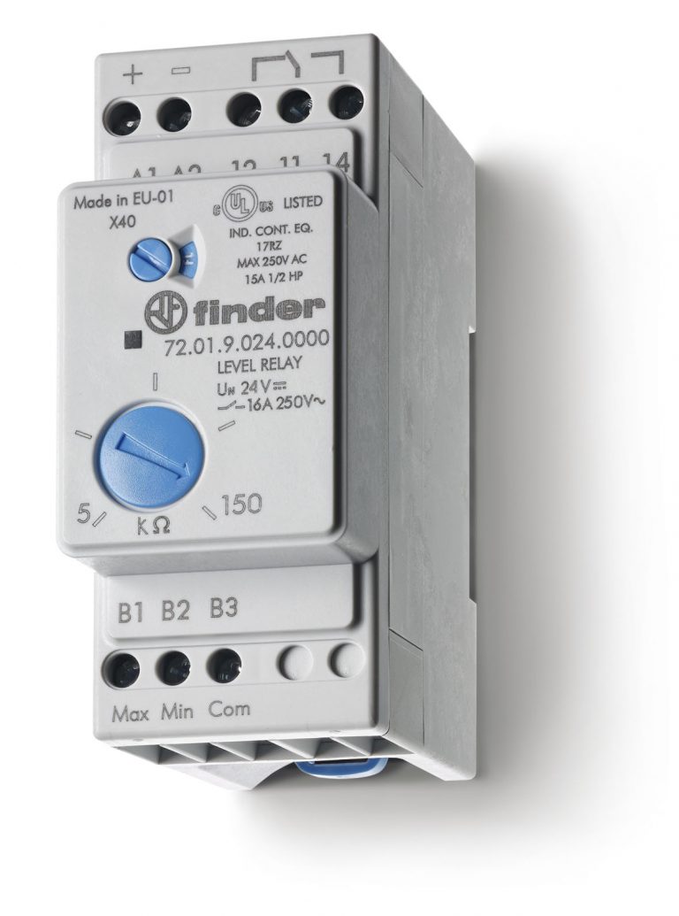 O Relé Finder de Controle de Nível para Líquidos Condutivos 72.01 da Finder trabalha para evitar que haja transferência de tensão elevada para dentro da água.