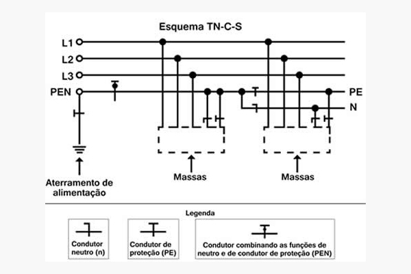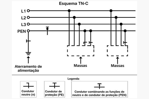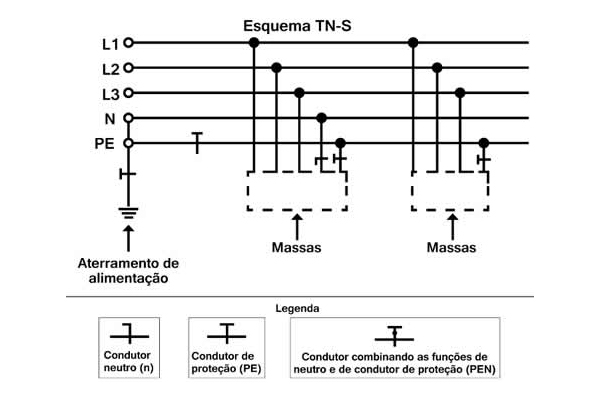 Sistema TN – O neutro é conectado diretamente à terra, enquanto as massas ficam conectadas ao próprio equipamento de terra do neutro, sendo que há dois tipos: