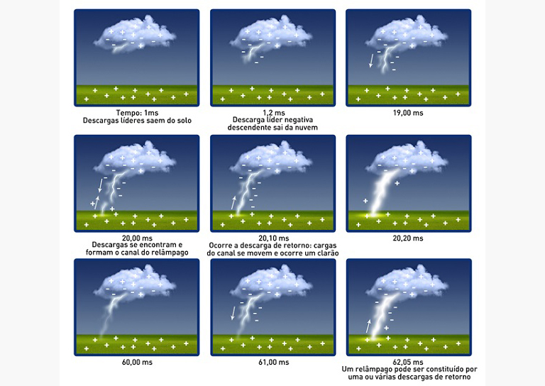 1) Raio descendente negativo (nuvem-terra): a descarga piloto vem do alto e tem carga negativa. O primeiro impacto do raio se caracteriza por uma corrente com valores entre 2/200 kA. Geralmente, após a primeira descarga, onde o canal ionizado já foi “aberto”, as correntes seguintes acabam tendo uma contribuição energética menor.