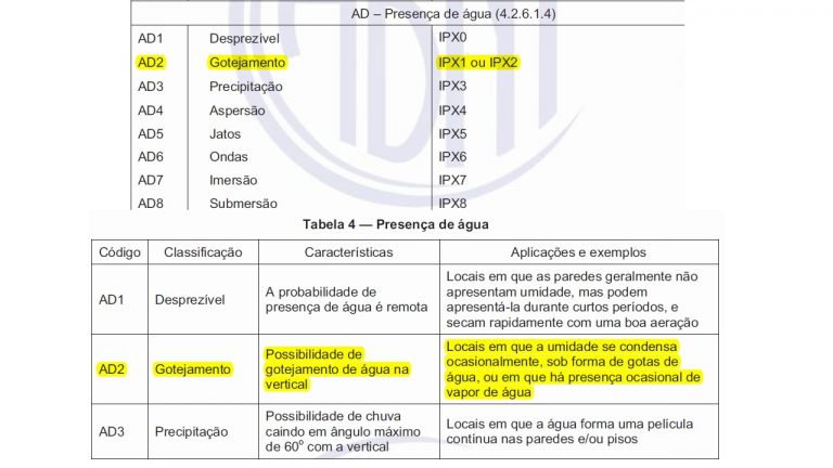 Quanto às características exigidas para seleção e instalação dos componentes em que dentre as influências externas existe a presença de água, os produtos devem ter IPX1 ou IPX2.