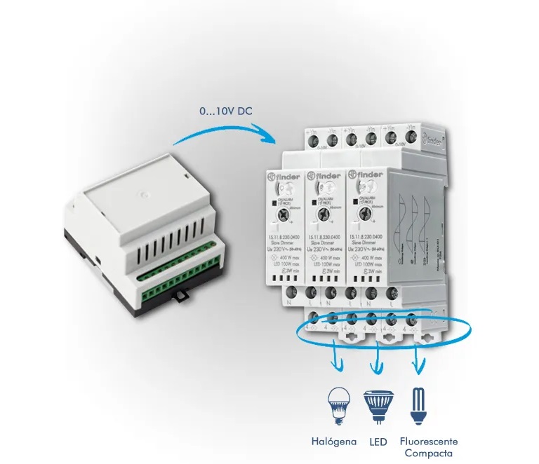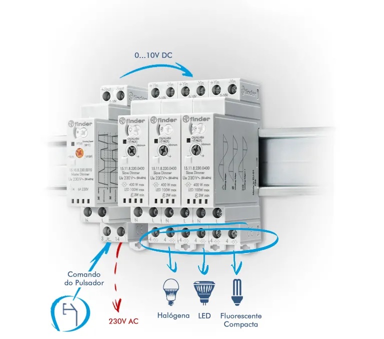 O MASTER Dimmer permite a dimerização de qualquer tipo de iluminação que possua reatores ou drivers com controle de 0-10V, como instalações com lâmpadas fluorescentes, luminárias e fitas de LED. O SLAVE Dimmer permite a dimerização de lâmpadas aplicadas diretamente a tensão de rede, como incandescentes, halógenas, fluorescentes compactas e LED dimerizáveis, podendo ainda trabalhar em conjunto com transformadores eletromagnéticos e eletrônicos dimerizáveis para lâmpadas em baixa tensão (VAC).