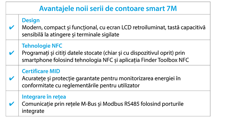 Noua serie a contoarelor de energie inteligente 7M se mândrește cu un design avansat și inovator, bogat în caracteristici, inclusiv capacitatea de a citi și de a programa contoarele folosind smartphone-uri cu tehnologie NFC. Fiind certificate MID și având capacitate de comunicație prin porturile M-Bus și Modbus RS485, aceste contoare sunt potrivite pentru o mulțime de aplicații.